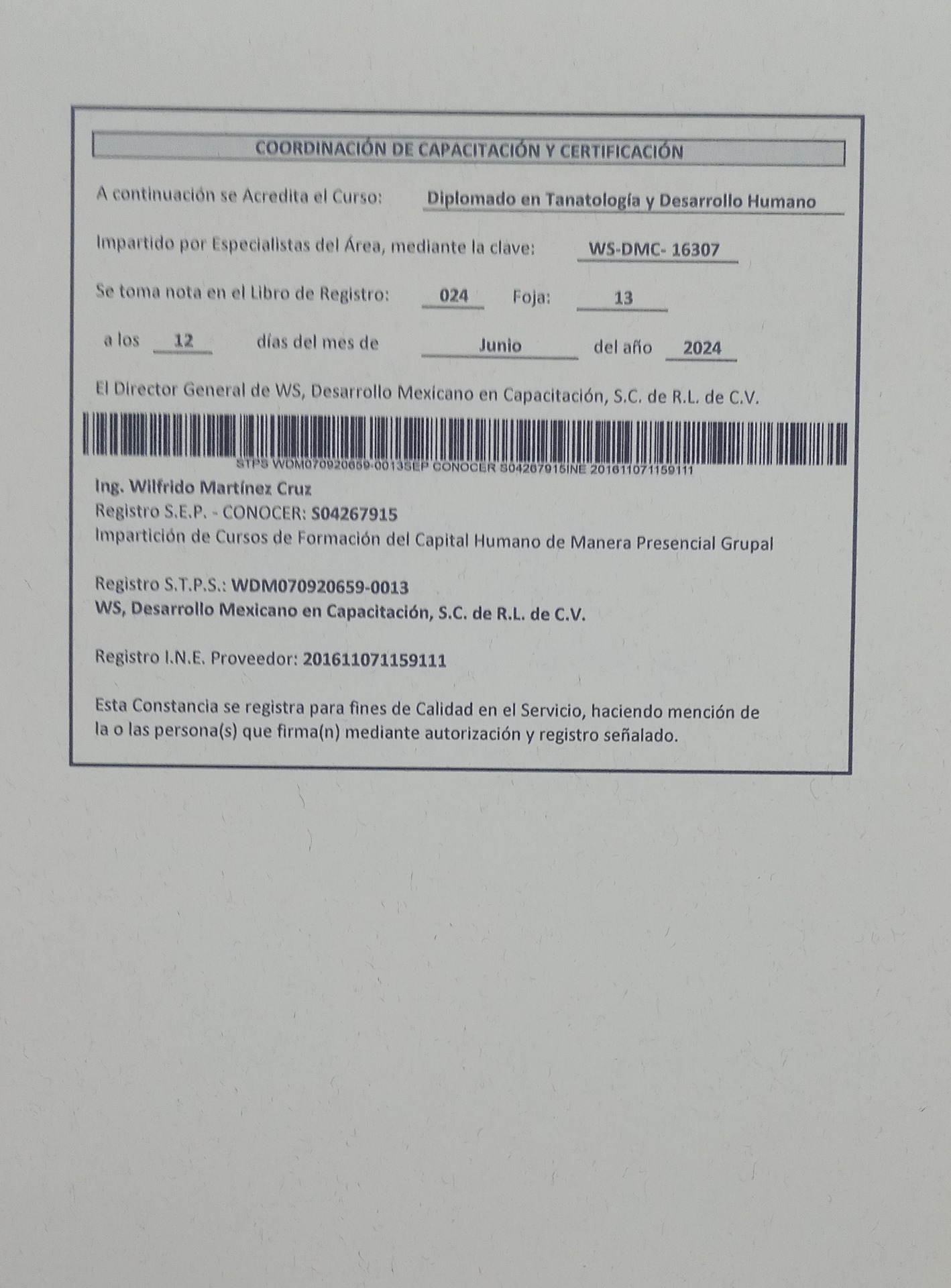 Constancia de Acreditación de Diplomado en Tanatología y Desarrollo Humano: