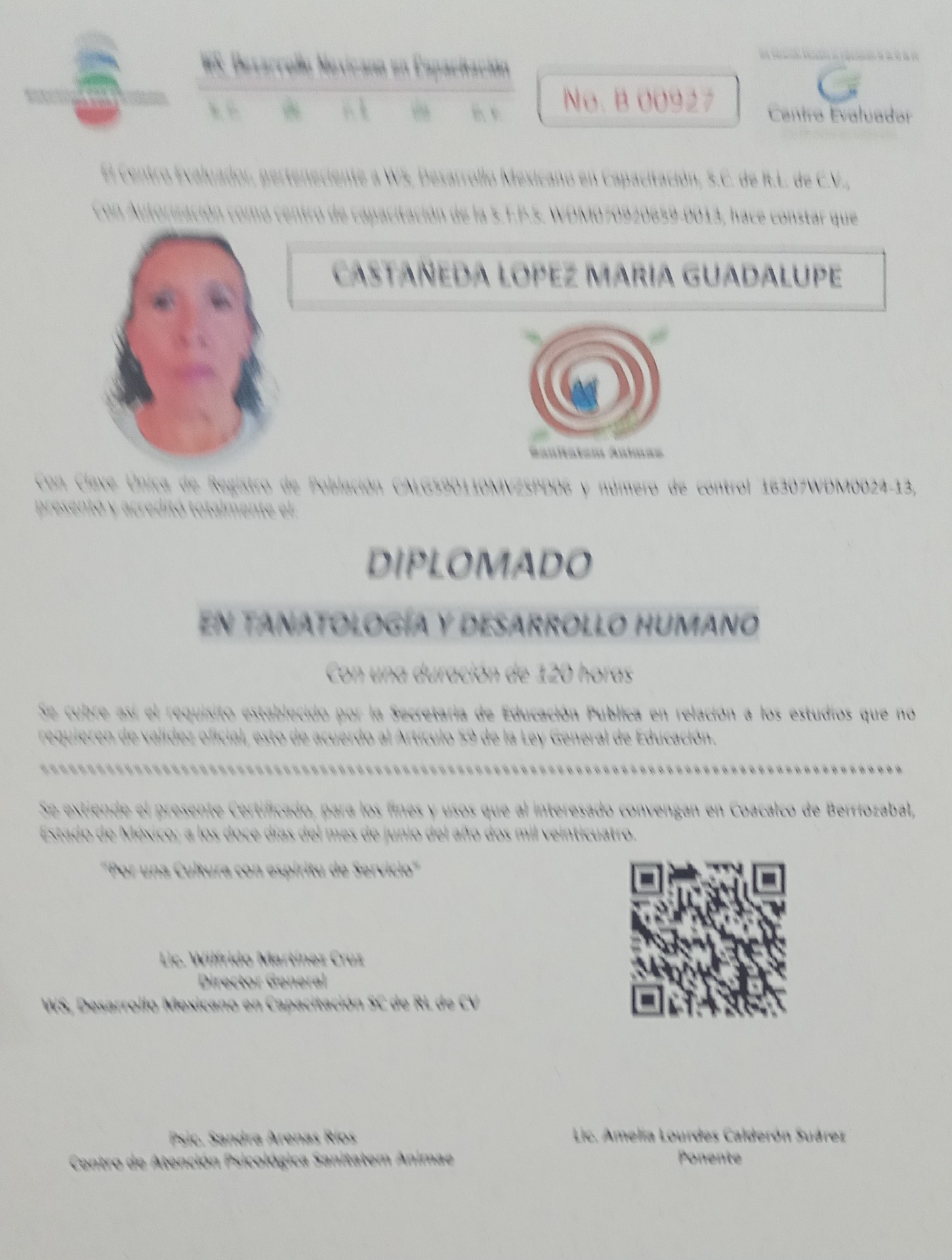 Constancia de Acreditación de Diplomado en Tanatología y Desarrollo Humano: