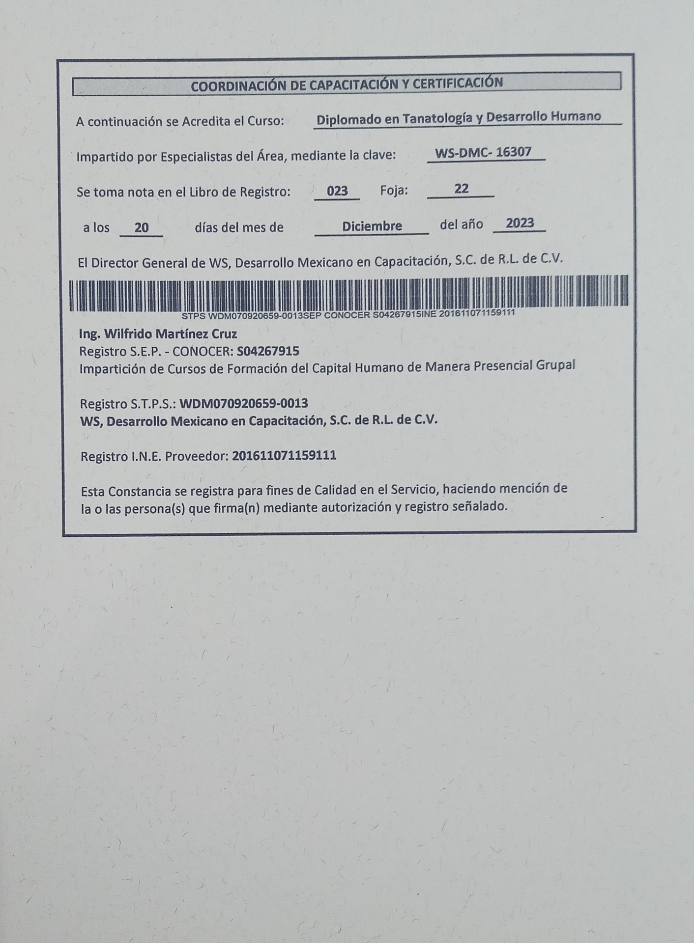 Constancia de Acreditación de Diplomado en Tanatología y Derechos Humanos: