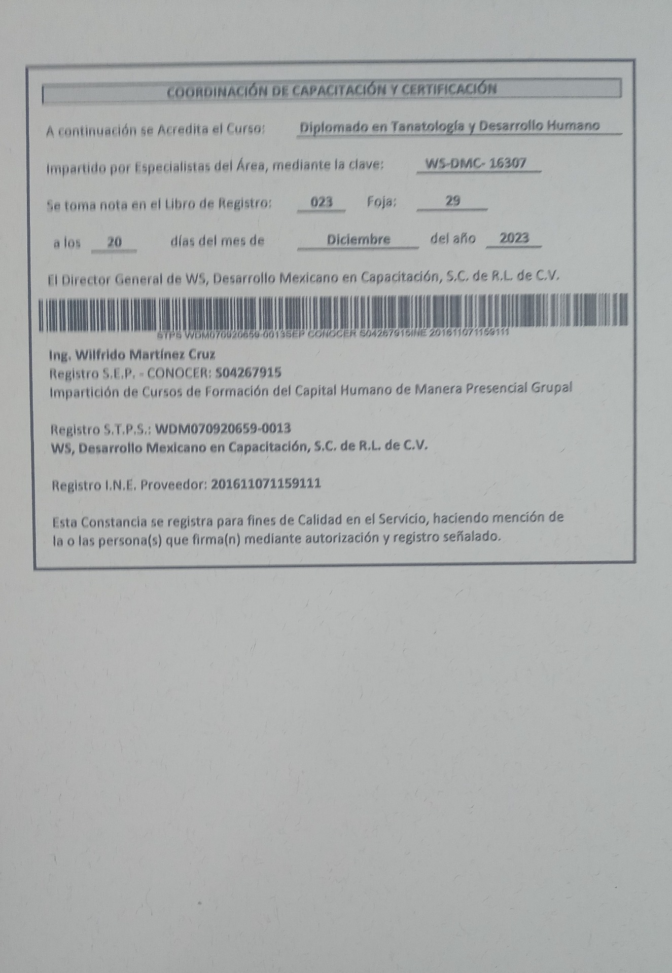 Constancia de Acreditación de Diplomado en Tanatología y Derechos Humanos: