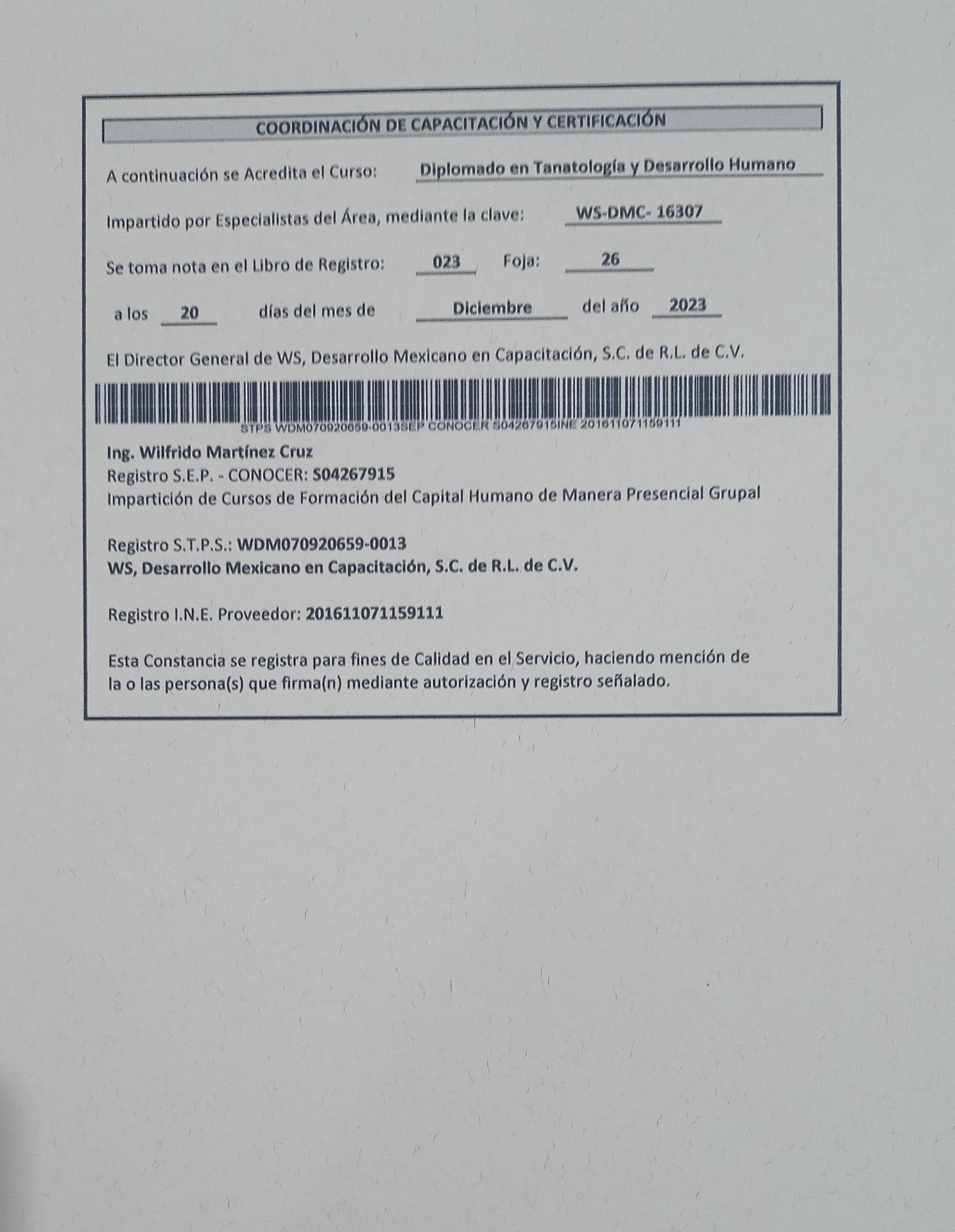 Constancia de Acreditación de Diplomado en Tanatología y Derechos Humanos: